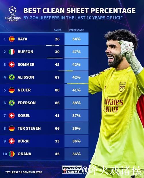 过去十年欧冠门将零封榜:拉亚54%居首,布冯47%紧随其后